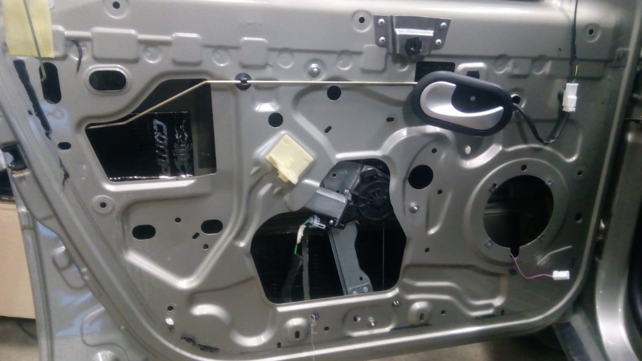 Разобрали обшивку, сняли всё лишнее. Обезжирили, где необходимо. Затем проклеили вибропластом внутреннюю сторону наружной стенки двери (частично). После этого закрыли отверстия во внутренней стенке и собрали двери.